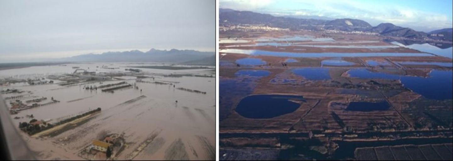 Photos from the Serchio River Basin, Italy. On the left Lake Massaciuccoli area during the flood of December 2009. On the right, Lake Massaciuccoli area during the drought of July 2017.