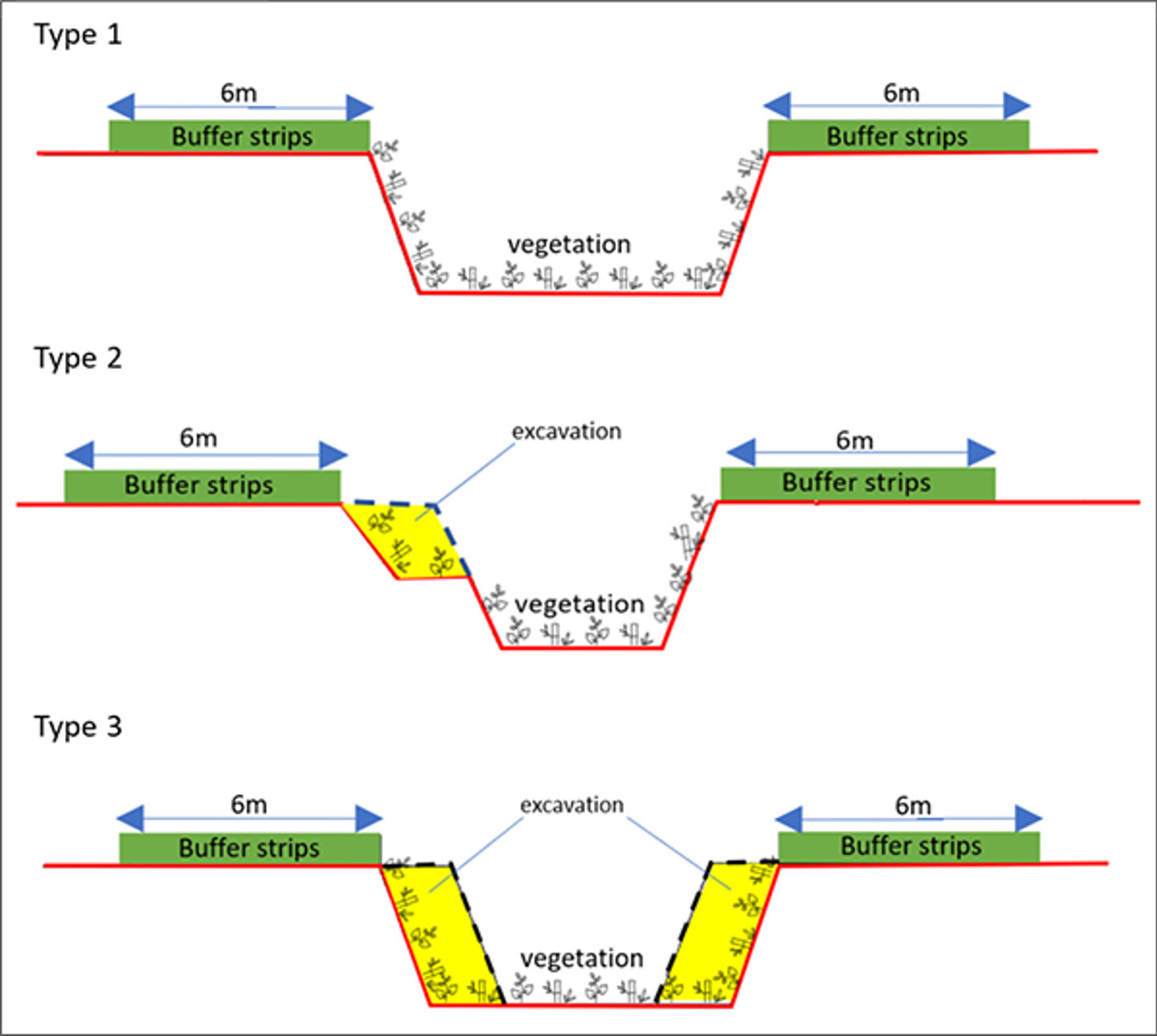The canals have been modified by enlarging the original trapezoidal cross section by constructing small ‘floodplains’ along the banks, increasing the practical section of the canals during flooding events. Furthermore, the modified cross-section provides a better environment for the bank vegetation, with carefully selected species.