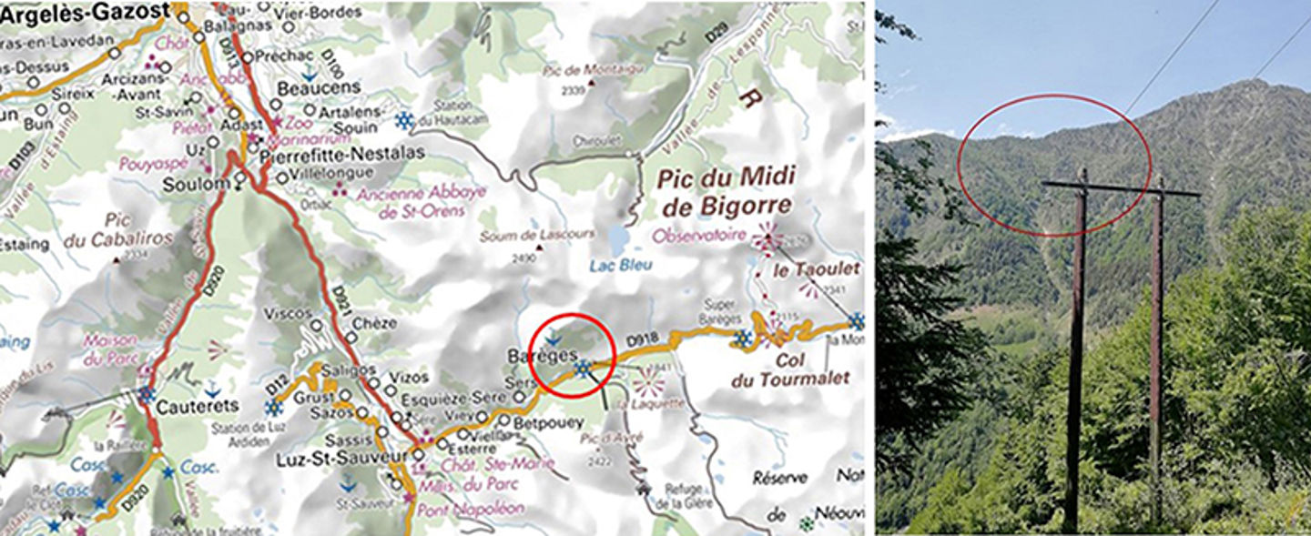 Left: The Bastan Valley, with Barèges in the red circle. Right: The release area of the snow avalanche path Midaou where the afforestation is taking place (red circle).