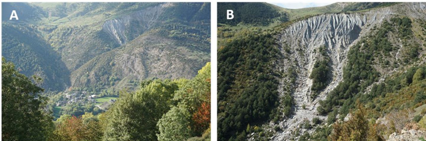 A) The Erill-la-Vall site is seen from the other side of the valley. The source area for debris flows in the upper part of the photo, and the village in the lower, central part. B) The release area for debris flows