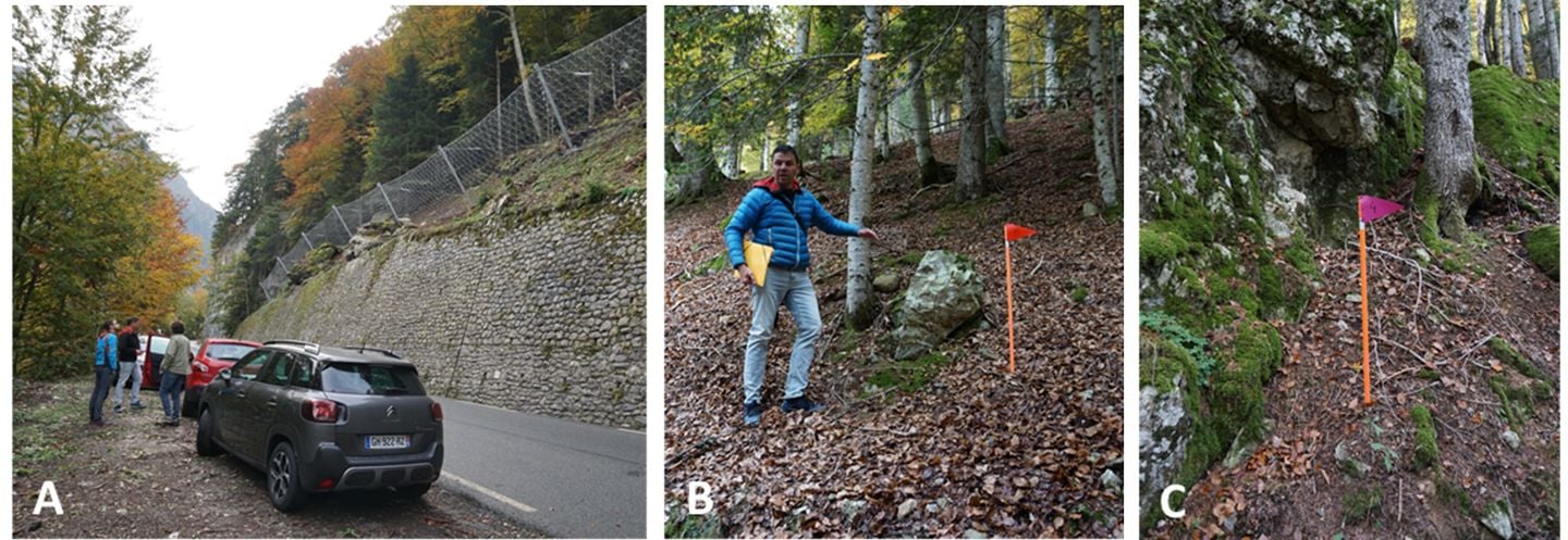 A) Newly established rock fall nets in one slope section at Artouste. B) Santiago Fabregas (EGTC Pireneos) shows a loose boulder, which is flagged to indicate the type of protective structure to be implemented. C) Rock ledge, a potential rock fall source, flagged for NBS protective measures.