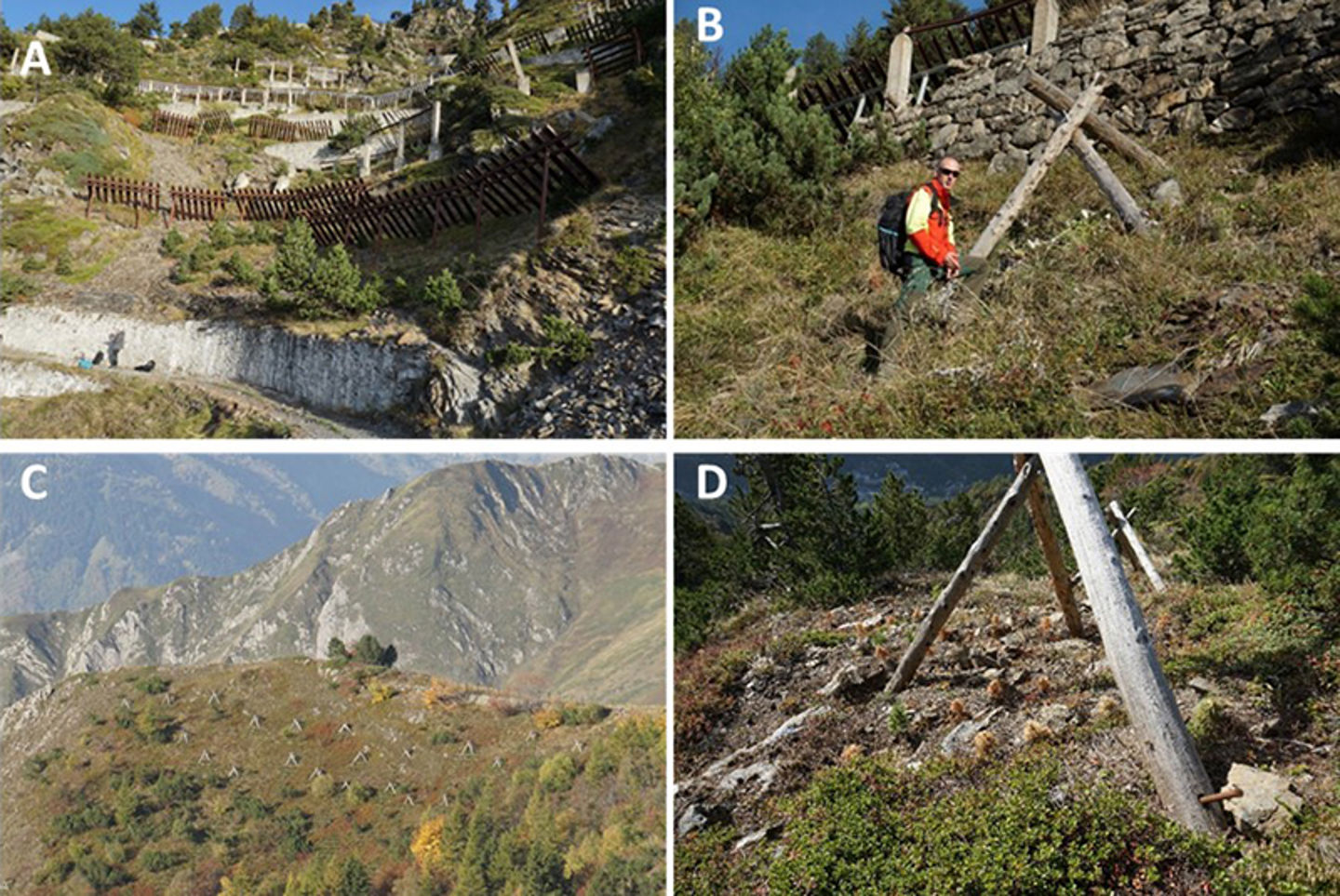 A) ‘Grey’ structures in the slope. B) ONF’s Laurent Lespine by one of the tripods for protection of new plants. C) Tripods protecting plants in a more barren part of the avalanche release area. Natural forests and old grey structures can be seen in the foreground. D) Example of plant collection where most plants have died, but still, enough for the purpose seem to survive.