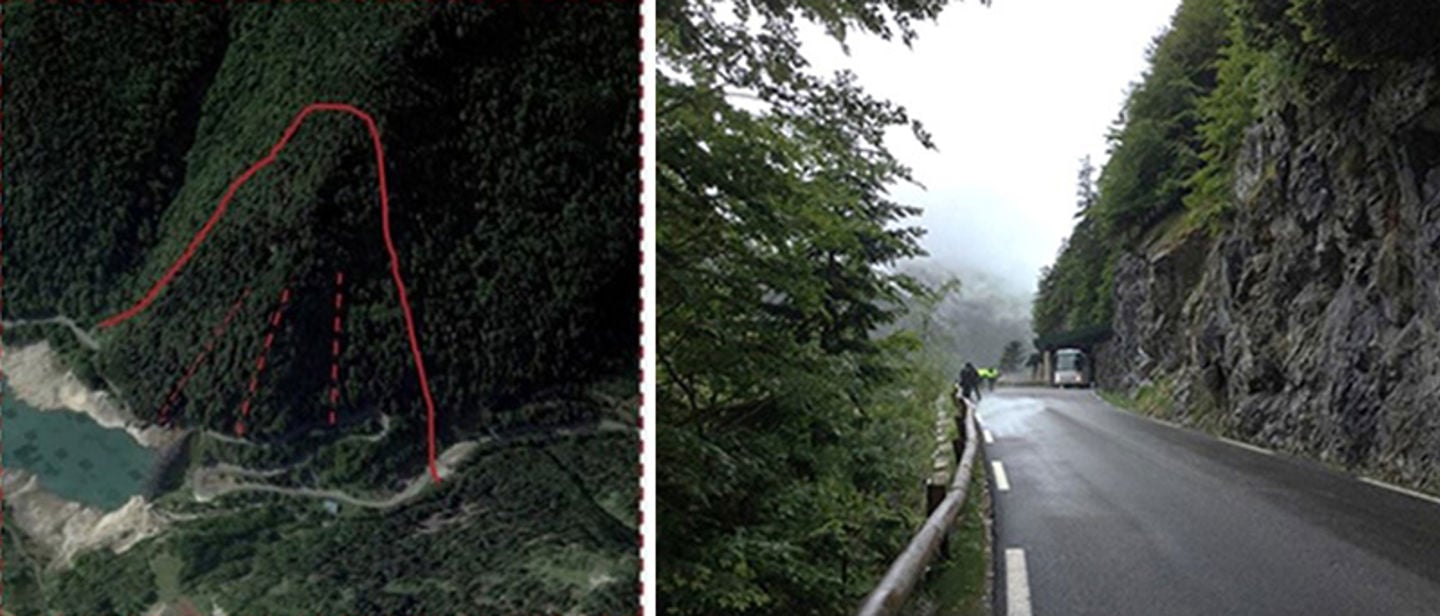 Overview of the rock fall area at Artouste (left) and part of the exposed road (right). Falling rocks come from the slope above the road, cut, and hit the road with high energy.