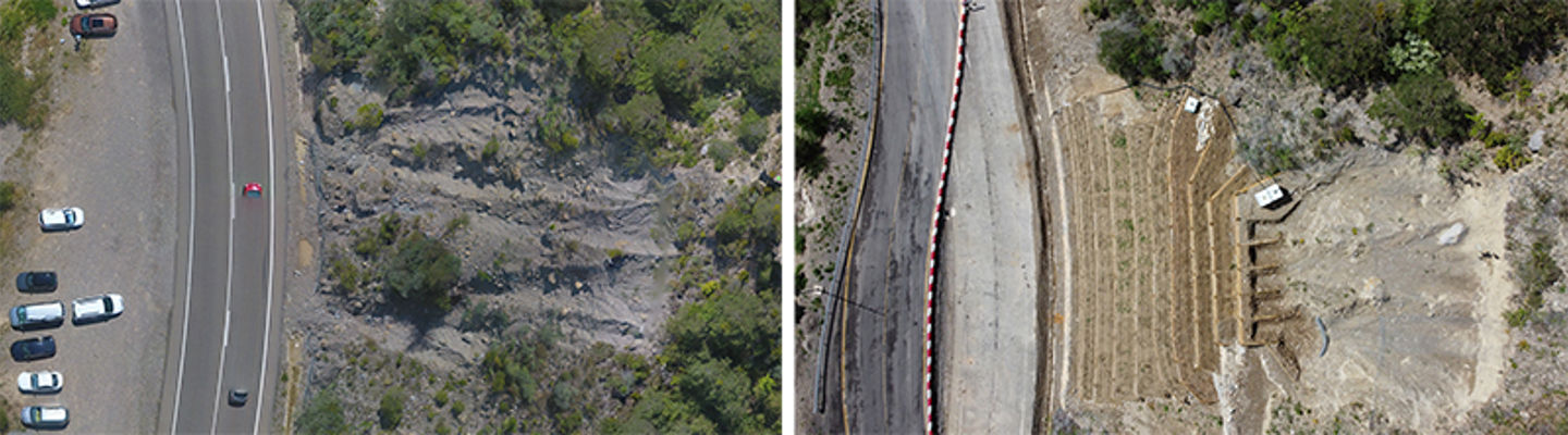 Drone photos of the site at Santa Elena before NBS interventions (left) and after completion (right). Photos by Santiago Fabregas, EGTC Pireneos – Pyrenees).