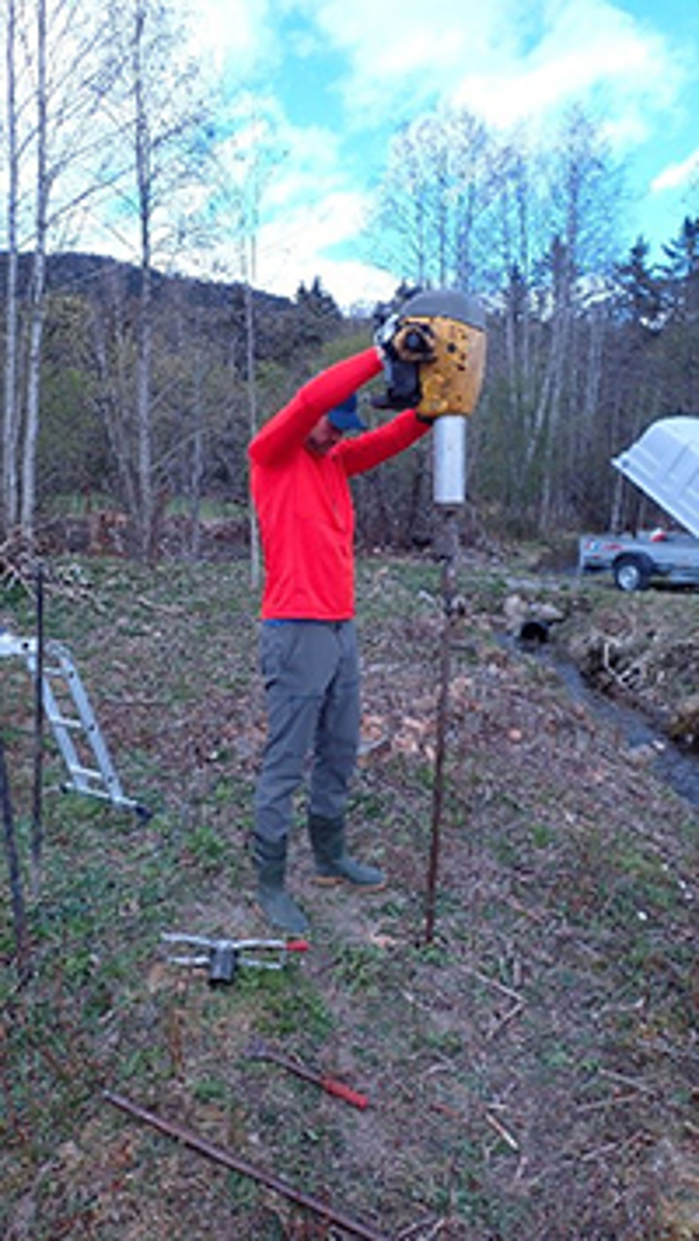 Stian installing pipes for the groundwater monitoring. The ground water level is presently high, as seen from the drainage ditch next to Stian.